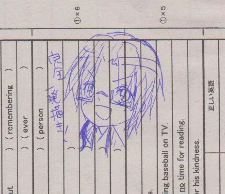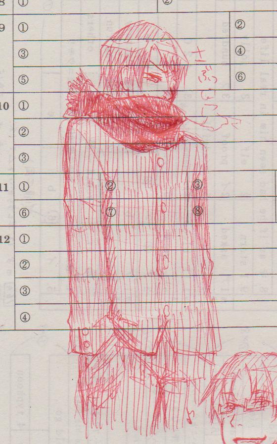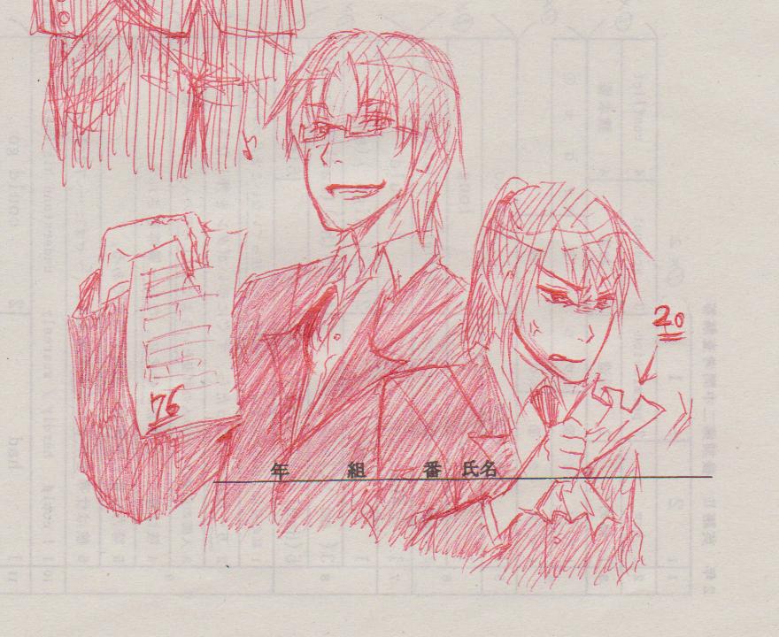 テスト返されて、(授業を1時間も聴かない所為か)4、50点代連発しまして、現実逃避に赤ペンで落書きしてました←